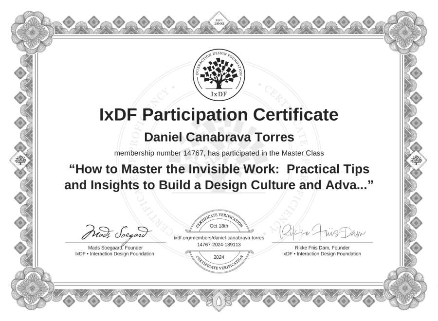 Daniel Canabrava Torres's IxDF Masterclass Certificate: How to Master the Invisible Work: Practical Tips and Insights to Build a Design Culture and Advance Your Career
