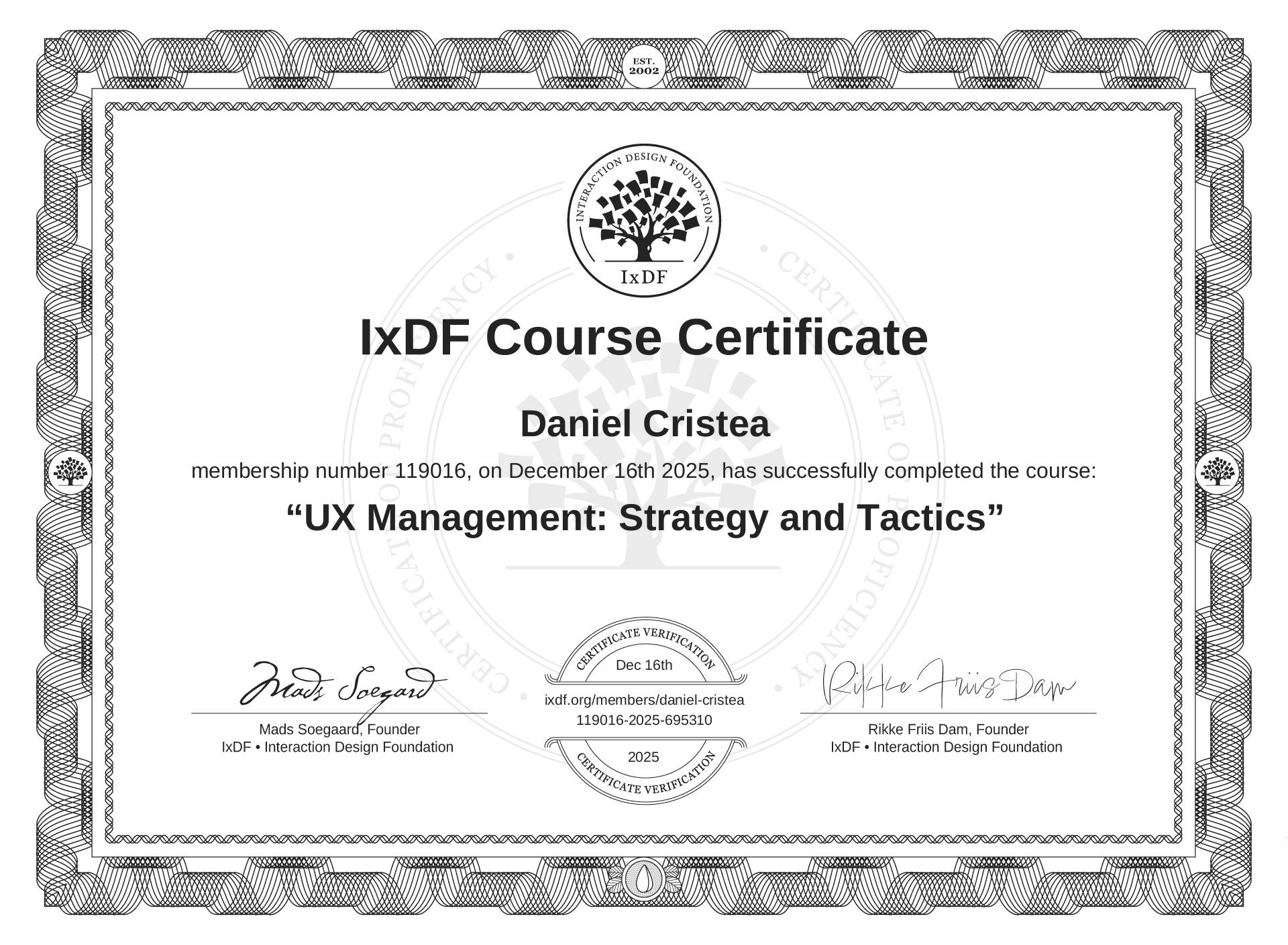 Daniel Cristea's IxDF Course Certificate: UX Management: Strategy and Tactics