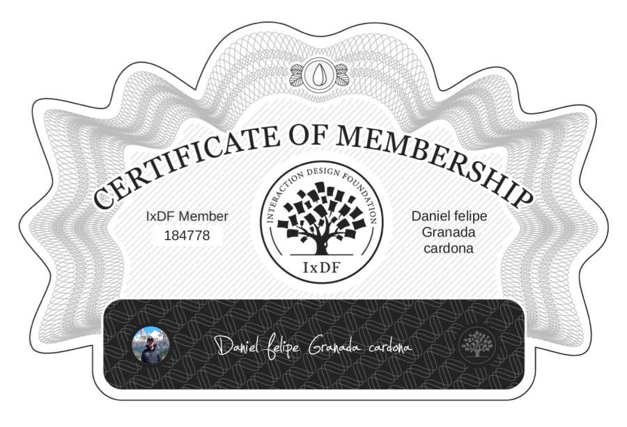 The Membership Certificate below verifies that Daniel felipe Granada cardona is a member of Interaction Design Foundation.