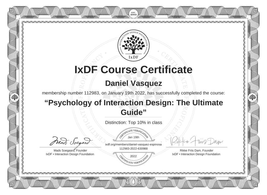 Daniel Vásquez's IxDF Course Certificate: Psychology of Interaction Design: The Ultimate Guide