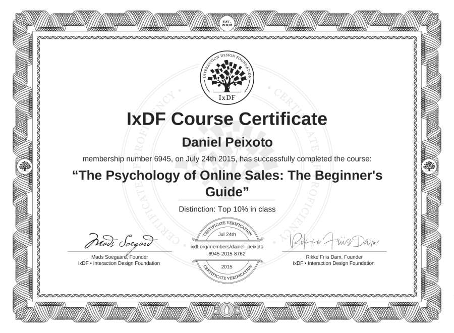 Daniel Peixoto's IxDF Course Certificate: The Psychology of Online Sales: The Beginner's Guide