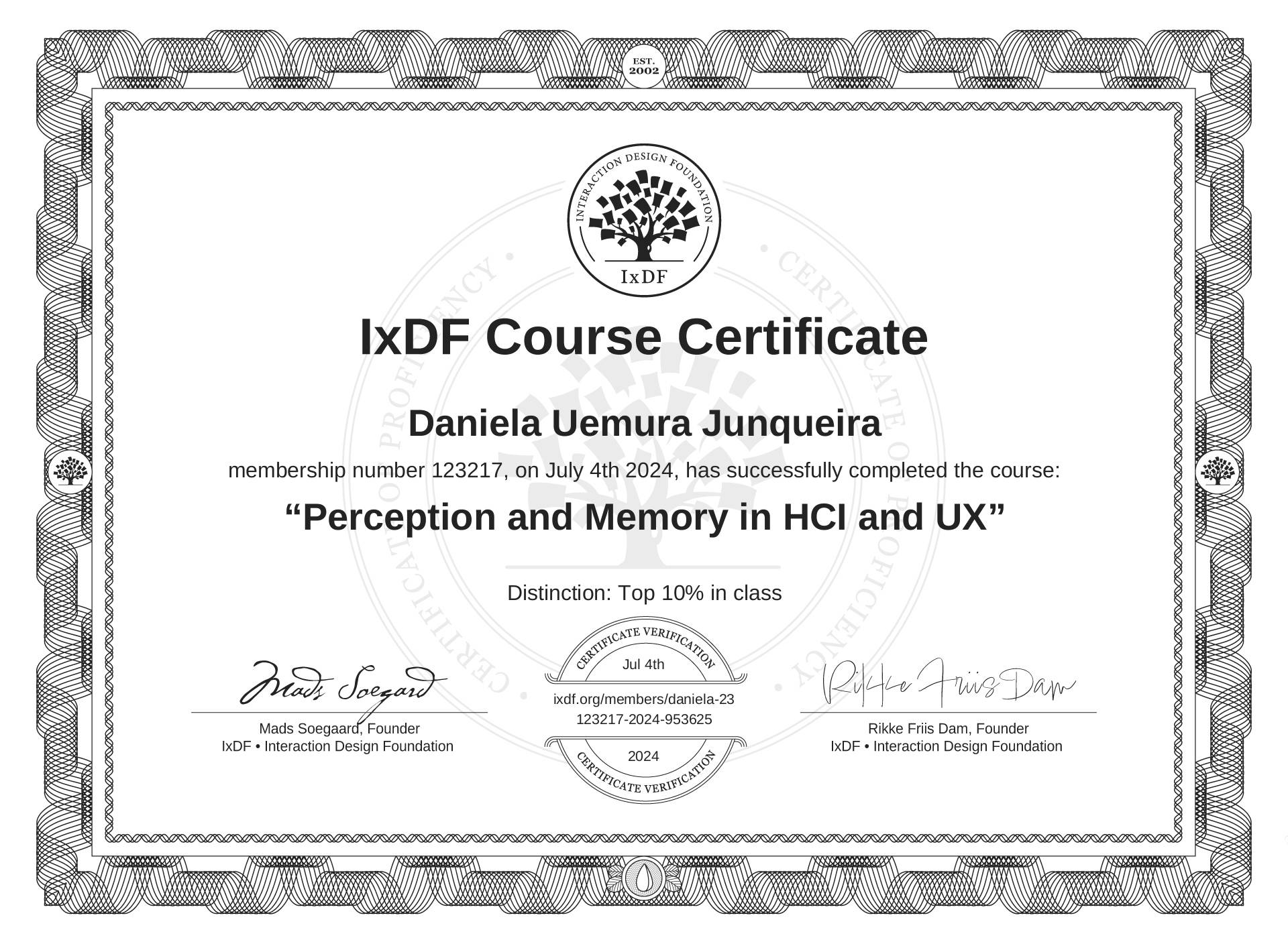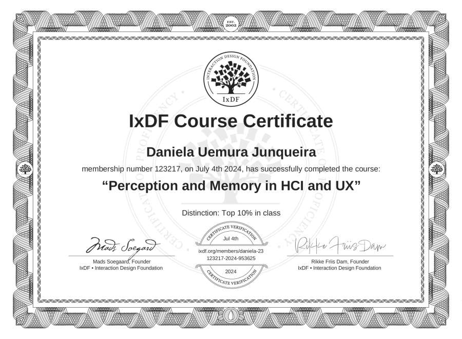 Daniela Uemura Junqueira's IxDF Course Certificate: Perception and Memory in HCI and UX