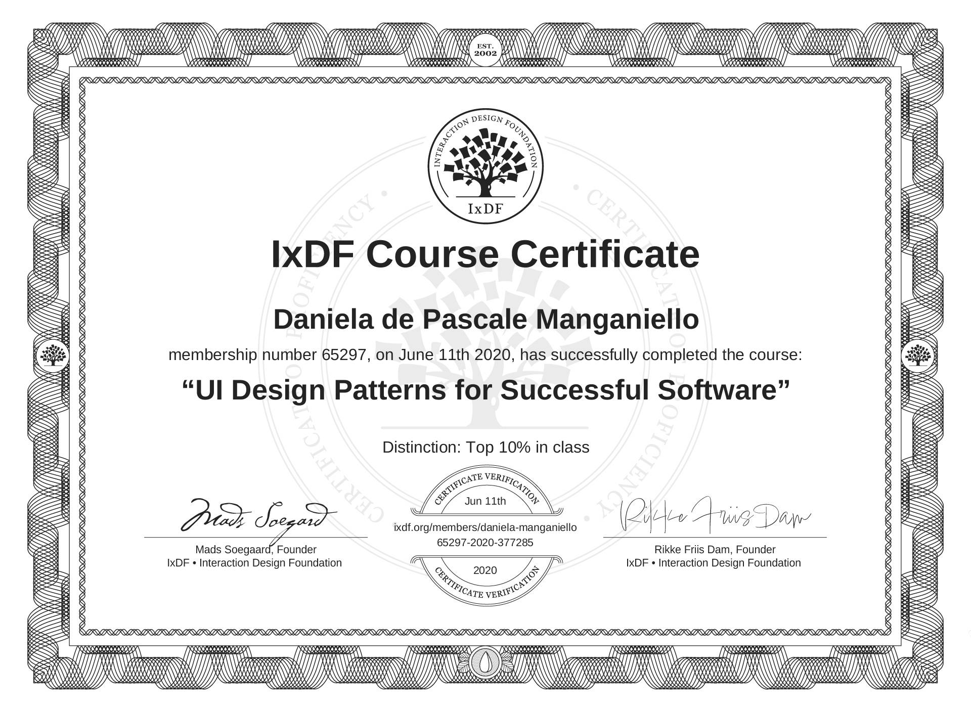The IxDF Course Certificate above is awarded to Daniela de Pascale Manganiello with a Top 10% Distinction in formal recognition of their coursework surpassing the rigorous benchmarks of exceptional performance established by the IxDF Educational Codex.