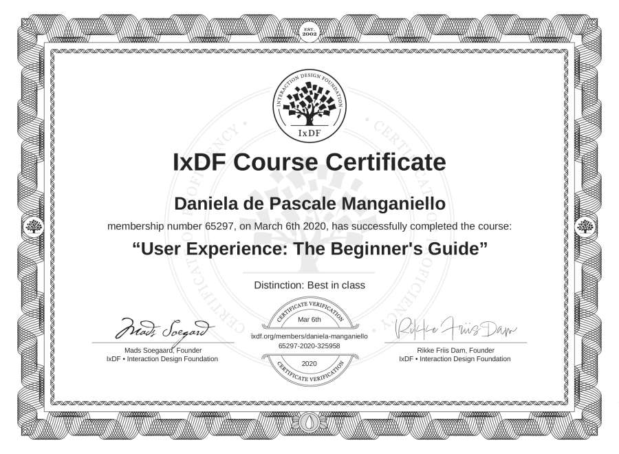 The IxDF Course Certificate above is awarded to Daniela de Pascale Manganiello with a Best in Class Distinction in formal recognition of their coursework surpassing the rigorous benchmarks of exceptional performance established by the IxDF Educational Codex.