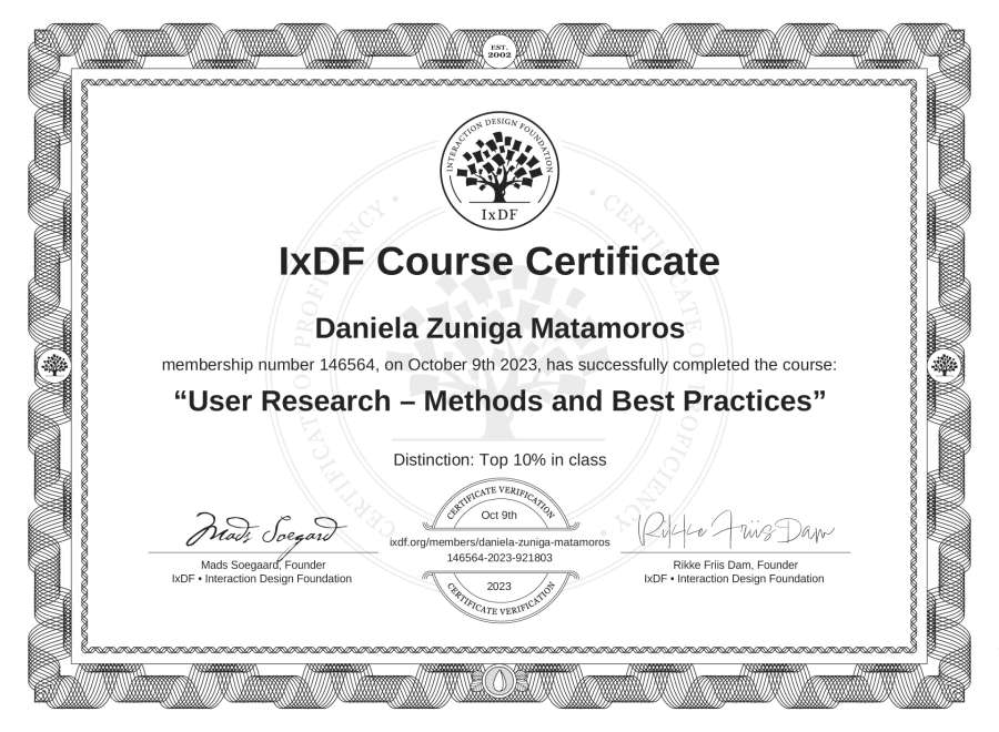Daniela Zúñiga Matamoros's IxDF Course Certificate: User Research – Methods and Best Practices