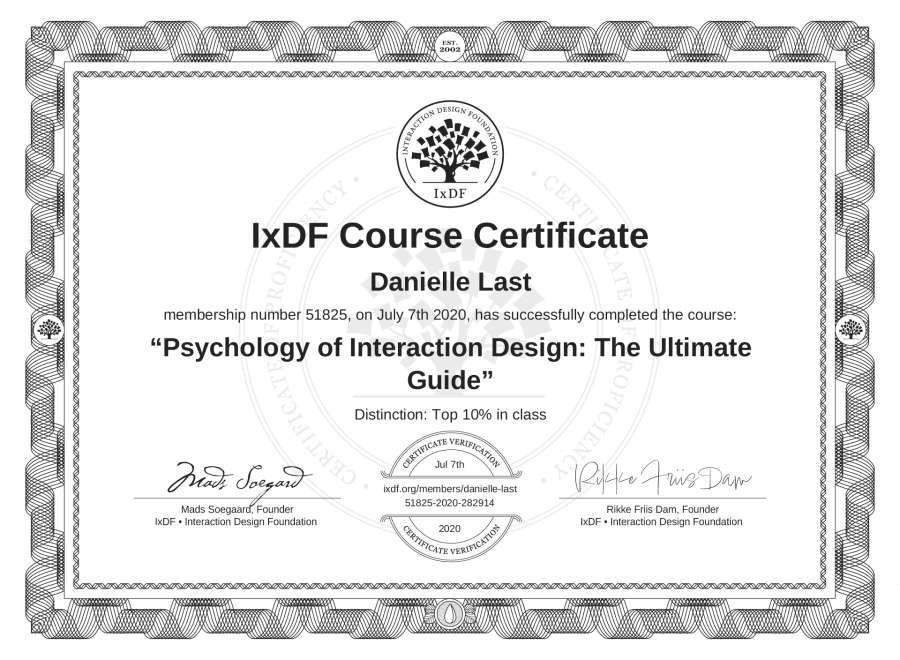 Danielle Last's IxDF Course Certificate: Psychology of Interaction Design: The Ultimate Guide