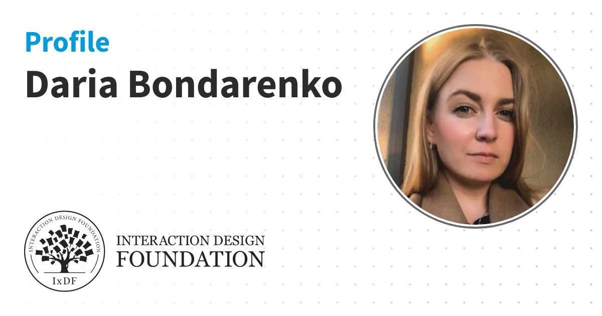 IxDF Course Certificates are awarded to Daria Bondarenko in formal recognition of their coursework surpassing the rigorous benchmarks of exceptional performance established by the IxDF Educational Codex.