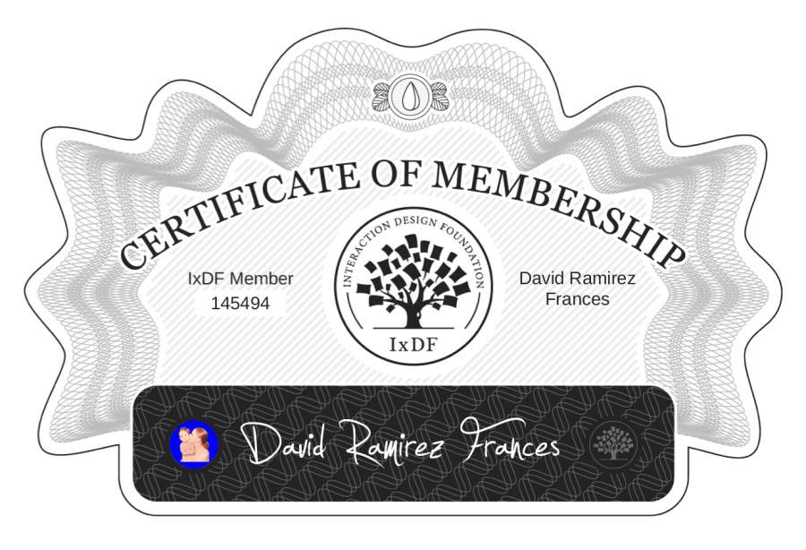 The Membership Certificate below verifies that David Ramírez Francés is a member of Interaction Design Foundation.