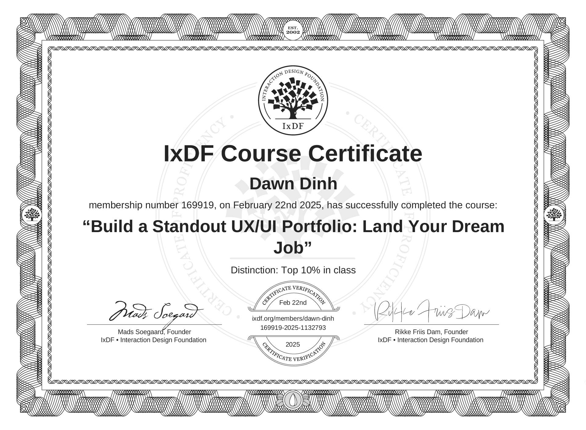 The IxDF Course Certificate above is awarded to Dawn Dinh with a Top 10% Distinction in formal recognition of their coursework surpassing the rigorous benchmarks of exceptional performance established by the IxDF Educational Codex.