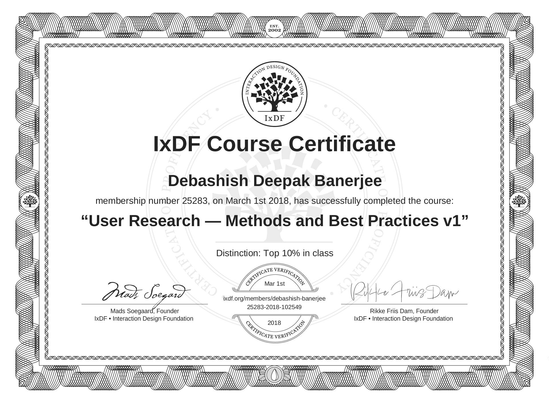 Debashish Deepak Banerjee's IxDF Course Certificate: User Research — Methods and Best Practices v1
