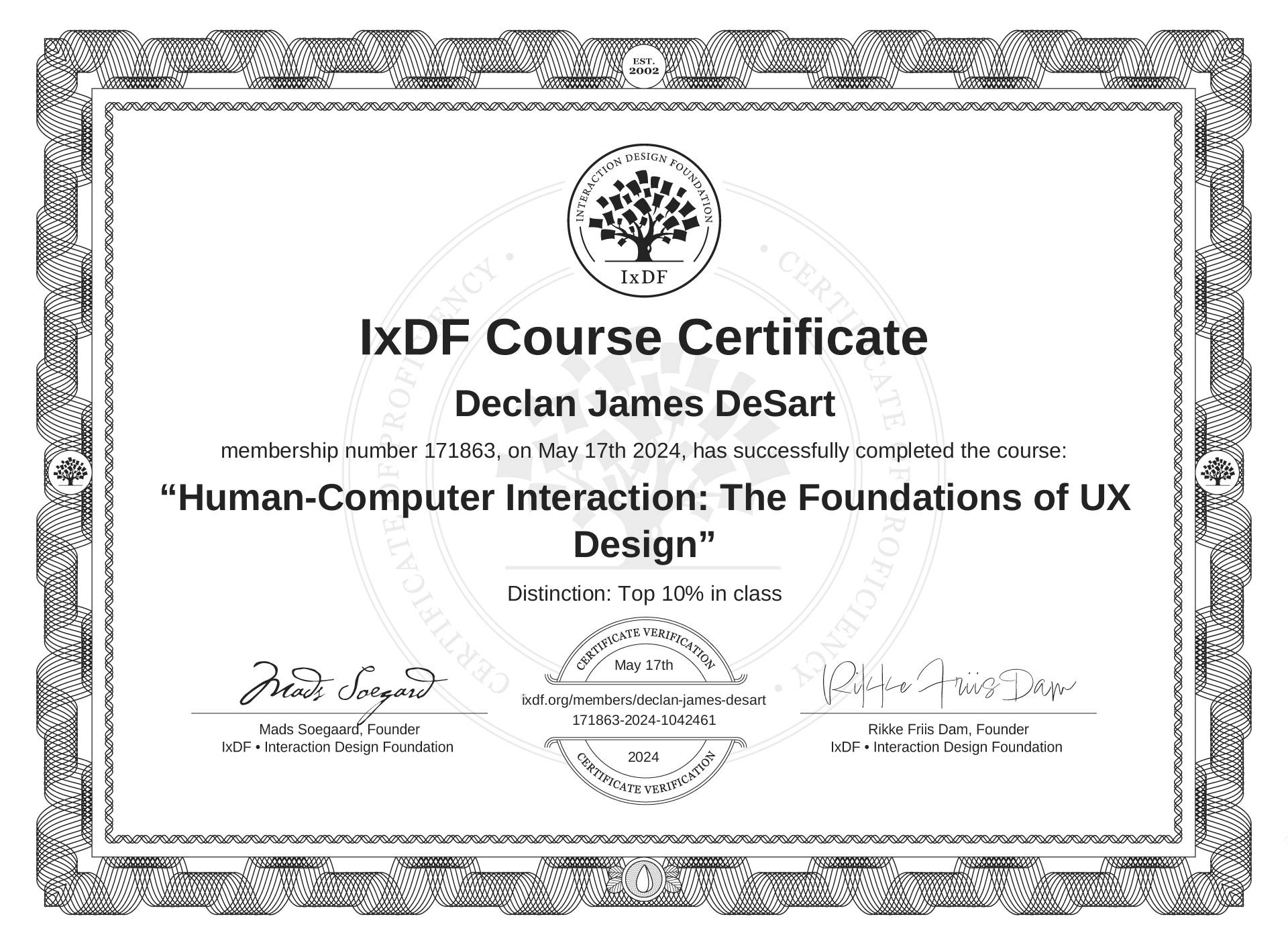 The IxDF Course Certificate above is awarded to Declan James DeSart with a Top 10% Distinction in formal recognition of their coursework surpassing the rigorous benchmarks of exceptional performance established by the IxDF Educational Codex.