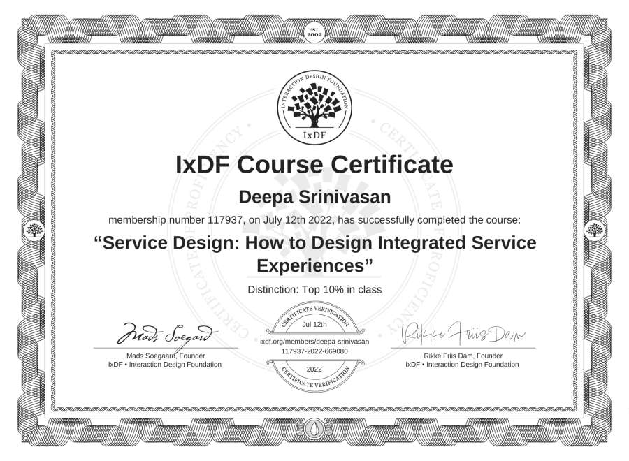 Deepa Srinivasan's IxDF Course Certificate: Service Design: How to Design Integrated Service Experiences