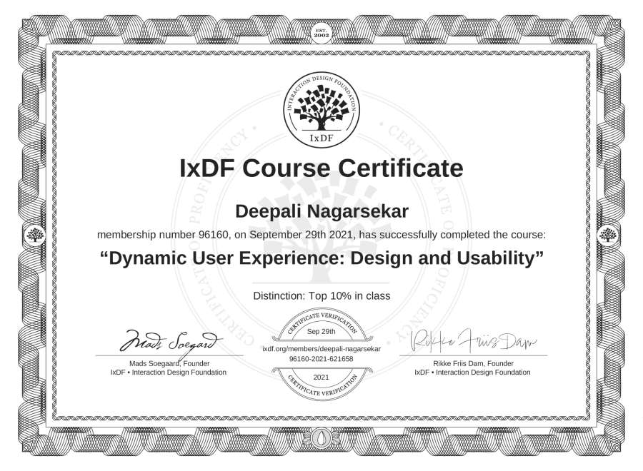 Deepali Nagarsekar's IxDF Course Certificate: Dynamic User Experience: Design and Usability