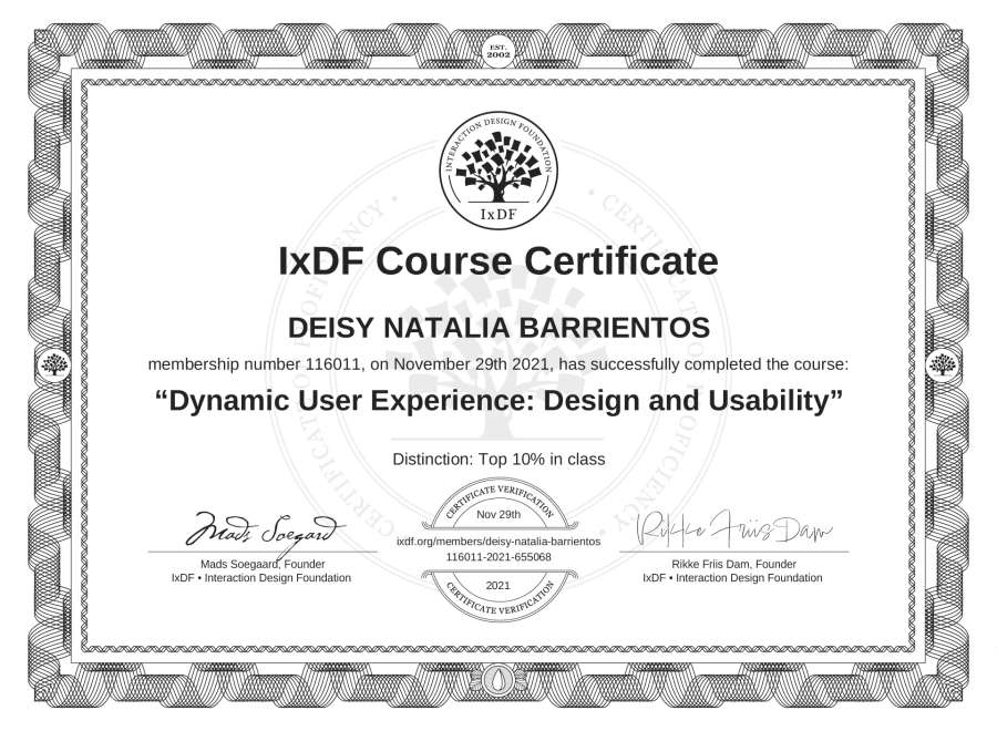 DEISY NATALIA BARRIENTOS's IxDF Course Certificate: Dynamic User Experience: Design and Usability