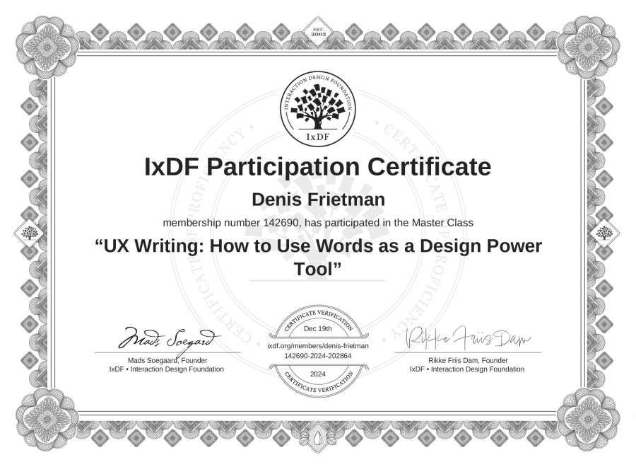 Denis Frietman's IxDF Masterclass Certificate: UX Writing: How to Use Words as a Design Power Tool