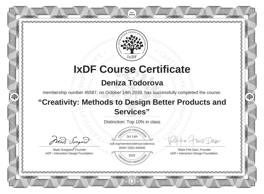 Deniza Todorova's IxDF Course Certificate: Creativity: Methods to Design Better Products and Services