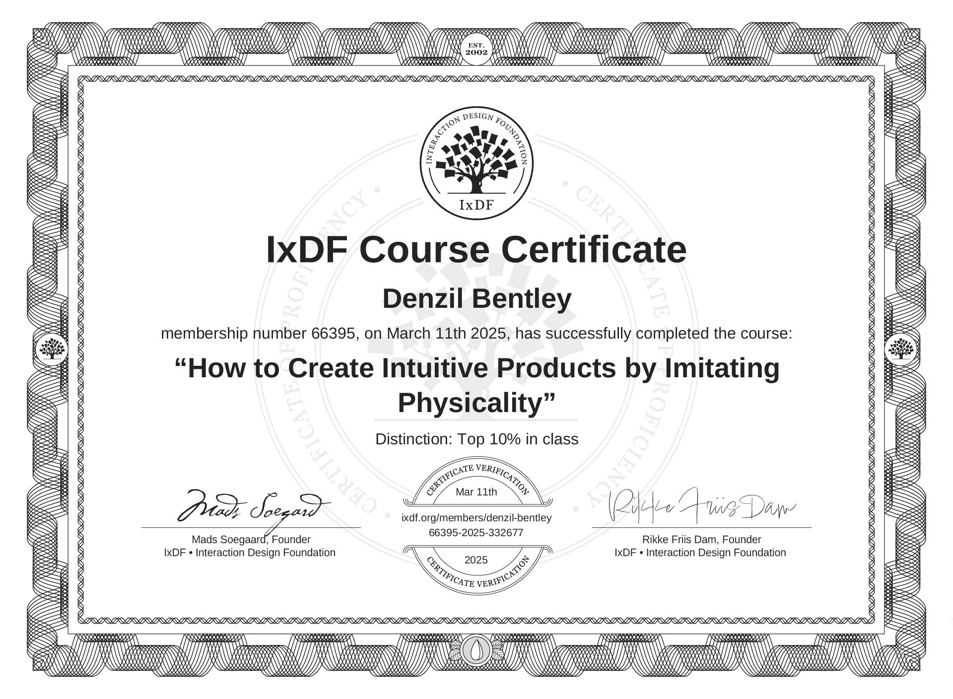 Denzil Bentley's IxDF Course Certificate: How to Create Intuitive Products by Imitating Physicality