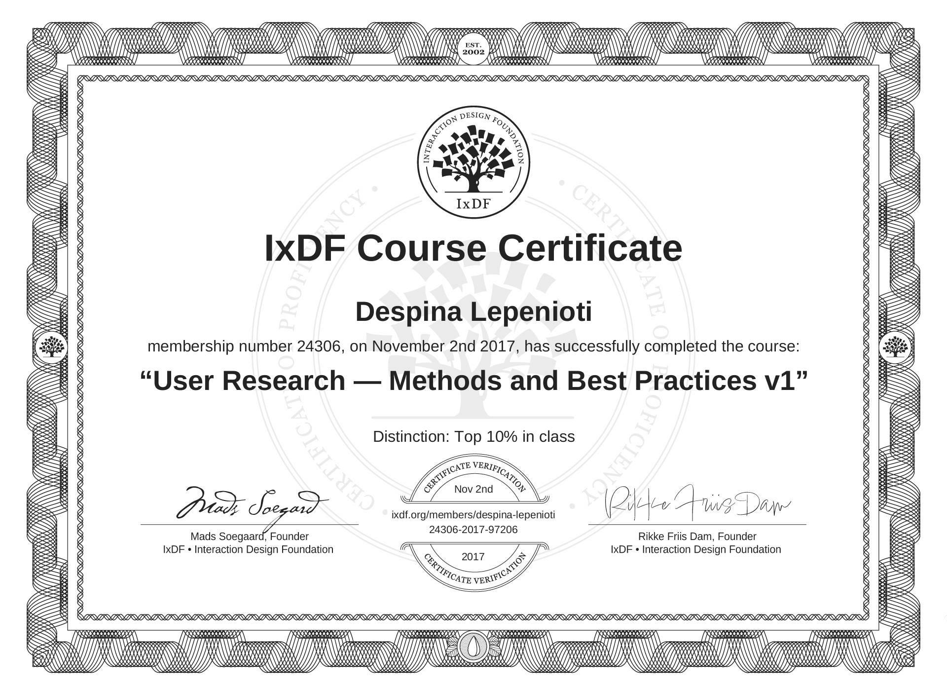Despina Lepenioti's IxDF Course Certificate: User Research — Methods and Best Practices v1