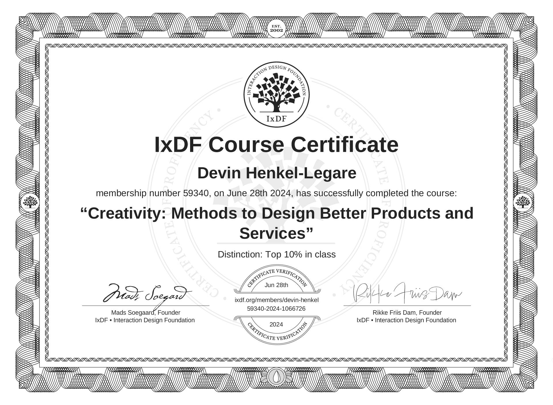 Devin Henkel-Legare's IxDF Course Certificate: Creativity: Methods to Design Better Products and Services