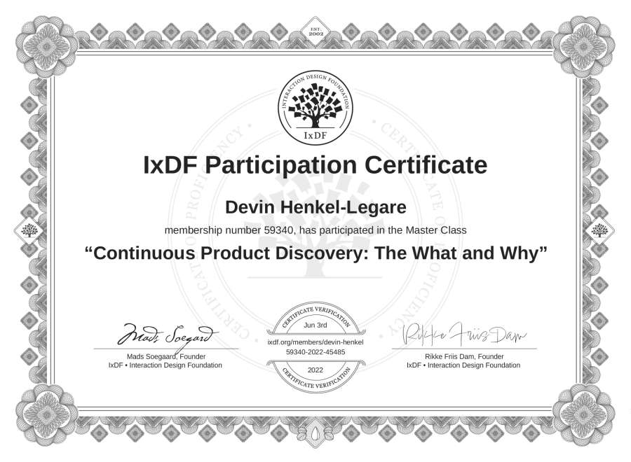 Devin Henkel-Legare's IxDF Masterclass Certificate: Continuous Product Discovery: The What and Why