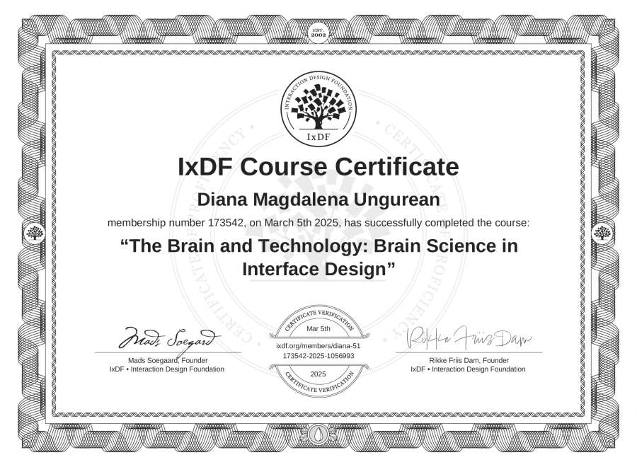 Diana Magdalena Ungurean's IxDF Course Certificate: The Brain and Technology: Brain Science in Interface Design