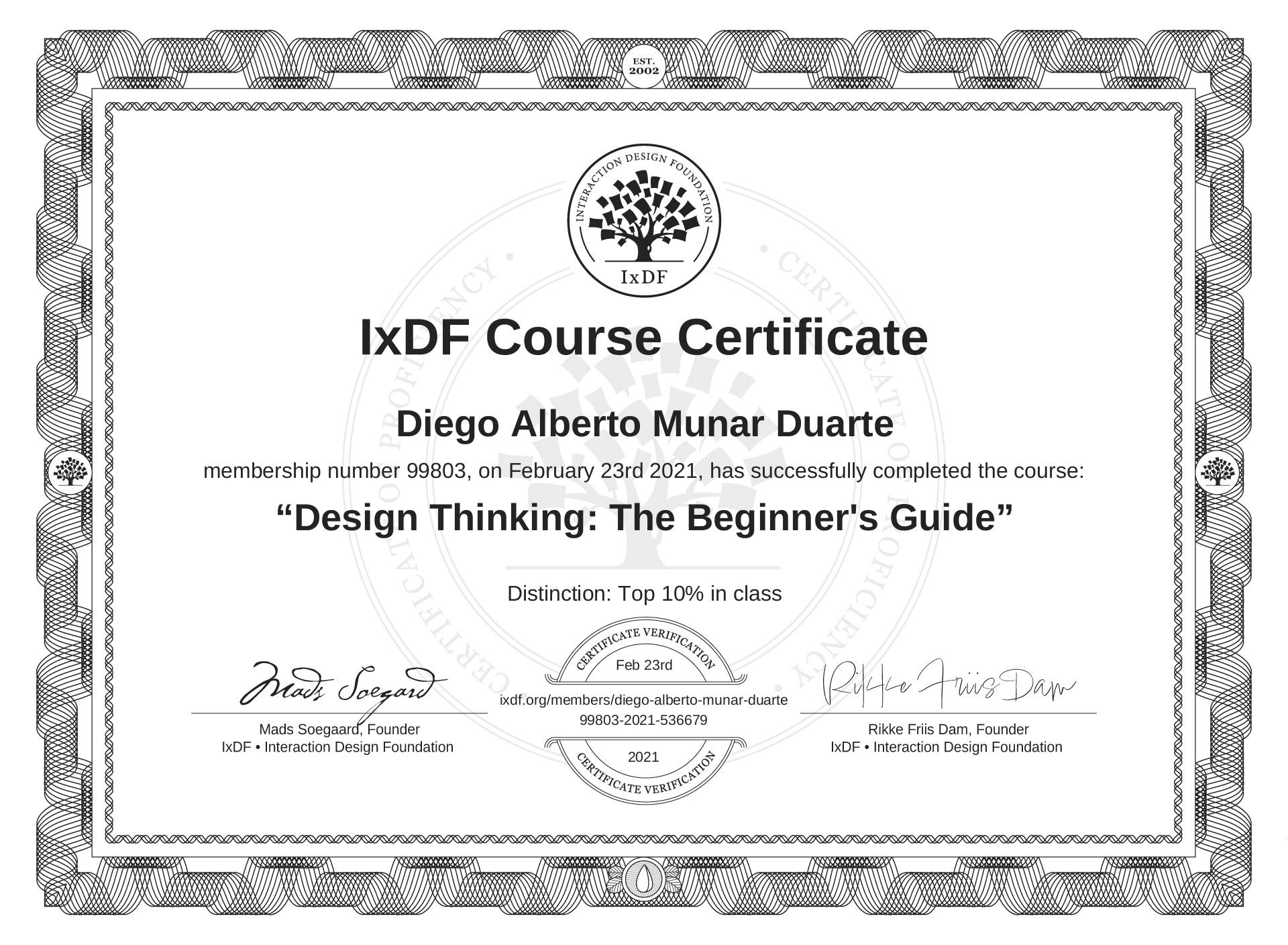 Diego Alberto Munar Duarte's IxDF Course Certificate: Design Thinking: The Beginner's Guide