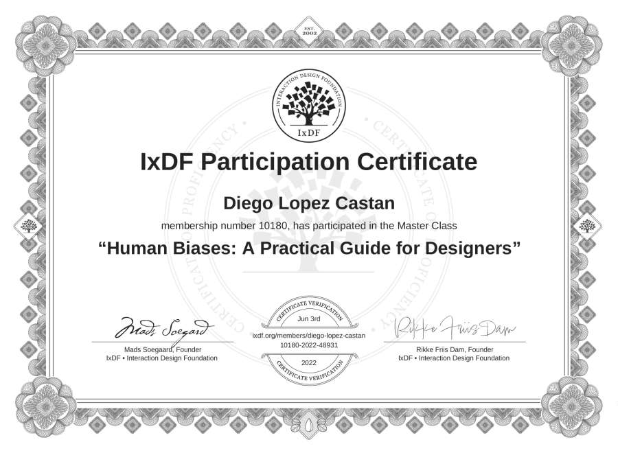 Diego Lopez Castan's IxDF Masterclass Certificate: Human Biases: A Practical Guide for Designers