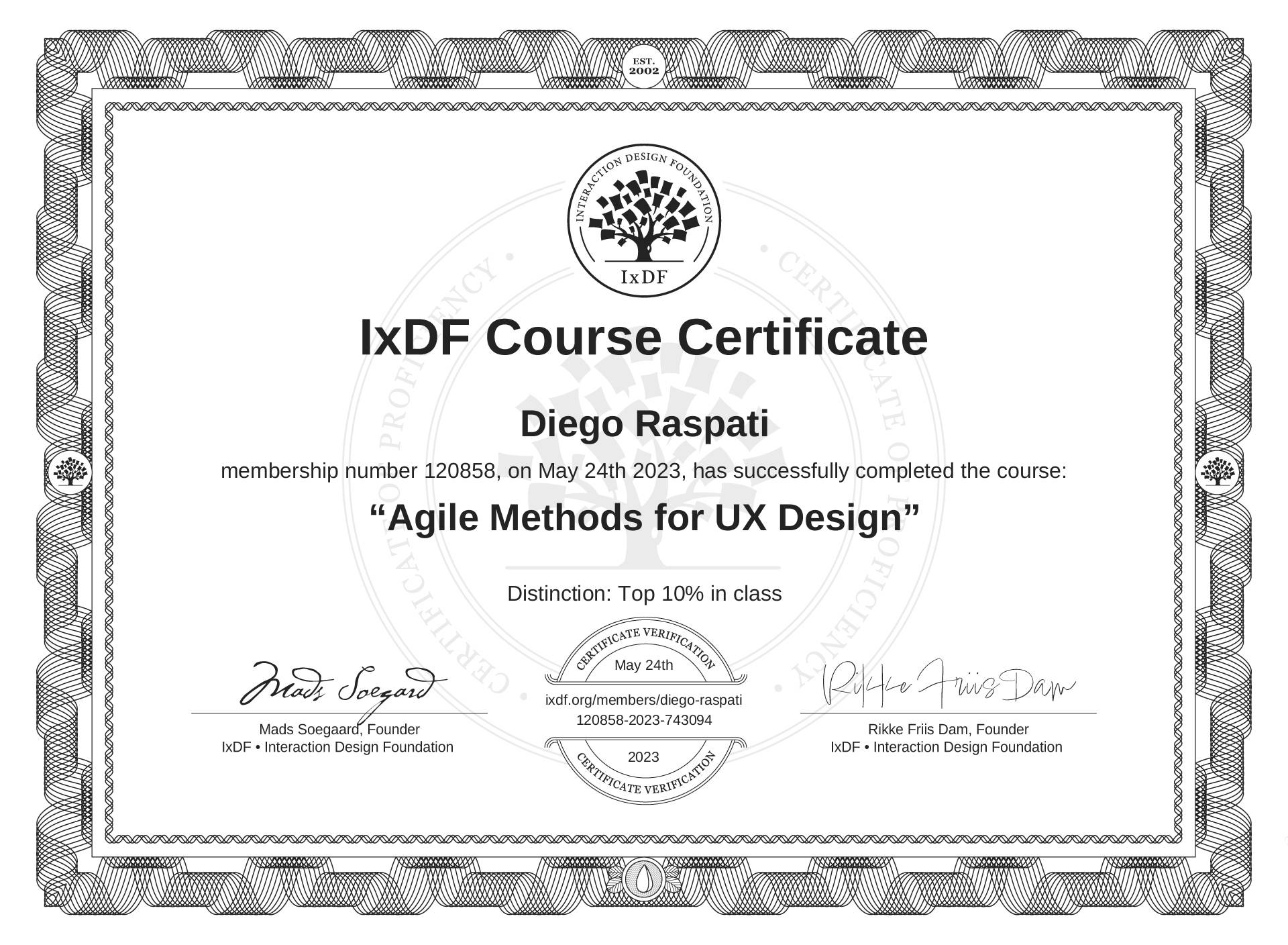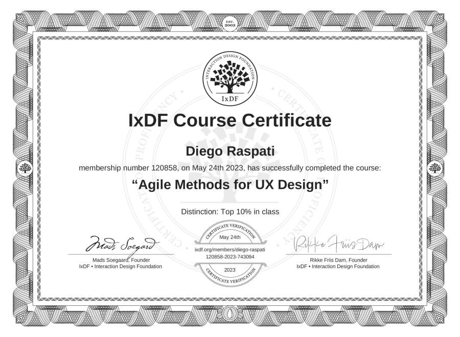 The IxDF Course Certificate above is awarded to Diego Raspati with a Top 10% Distinction in formal recognition of their coursework surpassing the rigorous benchmarks of exceptional performance established by the IxDF Educational Codex.