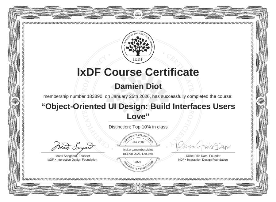 Damien Diot's IxDF Course Certificate: Object-Oriented UI Design: Build Interfaces Users Love