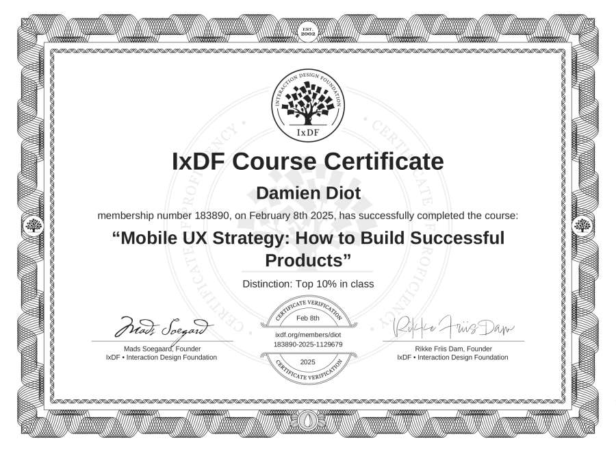 Damien Diot's IxDF Course Certificate: Mobile UX Strategy: How to Build Successful Products