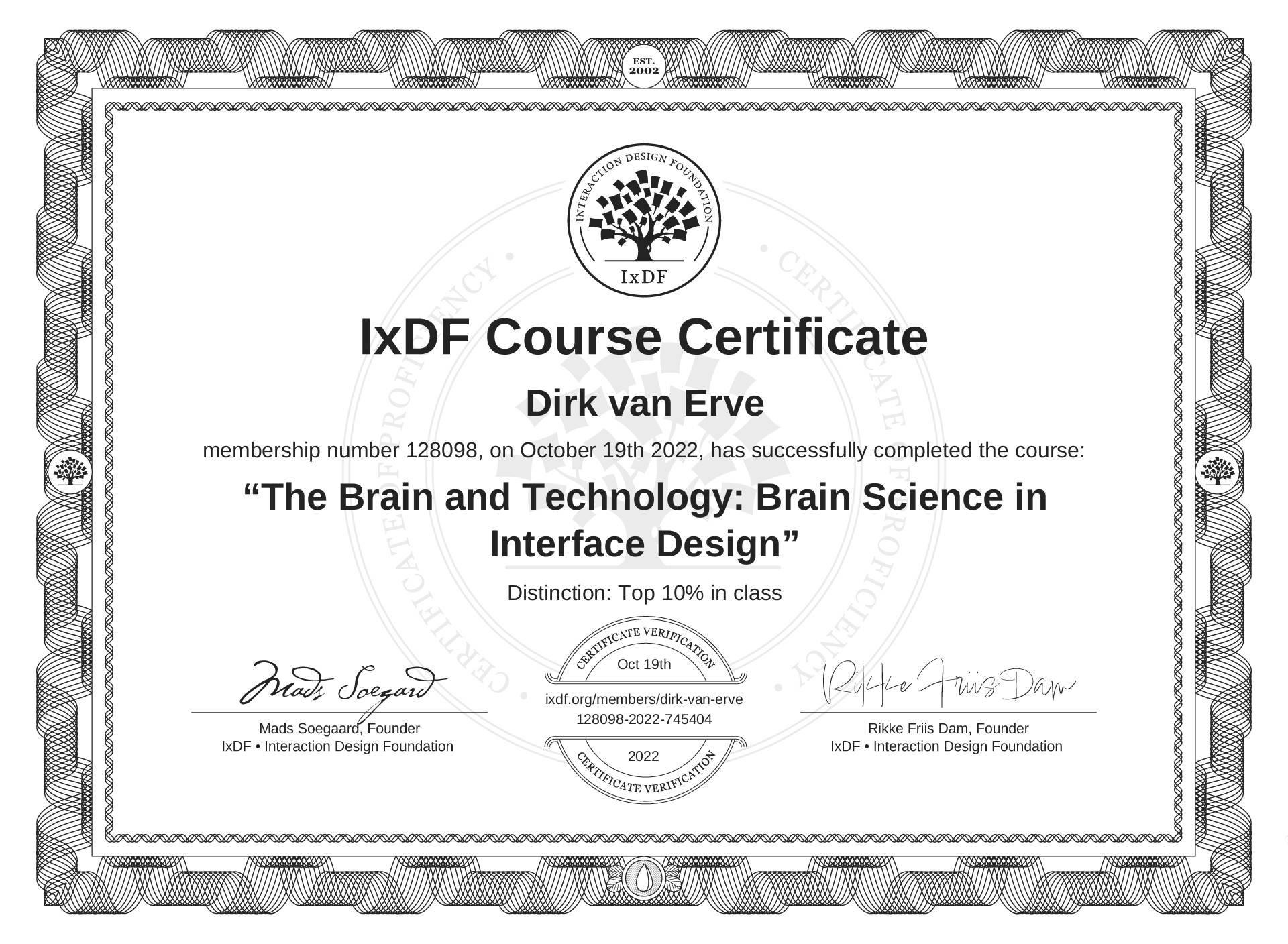 Dirk van Erve's IxDF Course Certificate: The Brain and Technology: Brain Science in Interface Design
