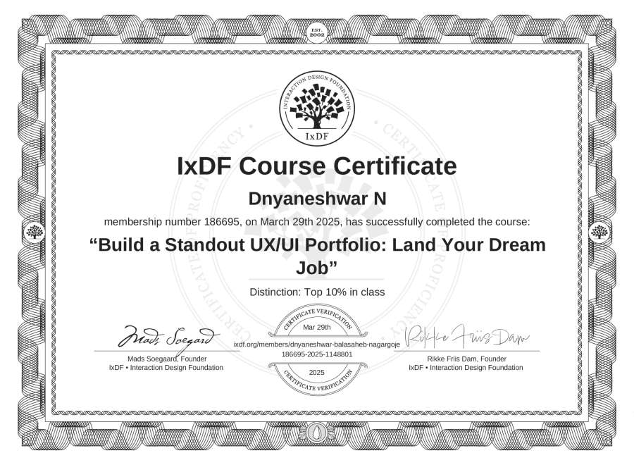 Dnyaneshwar N's IxDF Course Certificate: Build a Standout UX/UI Portfolio: Land Your Dream Job