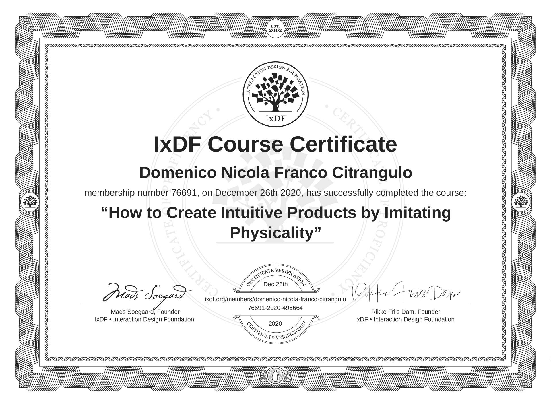 Domenico Nicola Franco Citrangulo's IxDF Course Certificate: How to Create Intuitive Products by Imitating Physicality