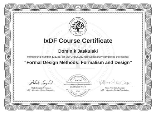 IxDF Course Certificates are awarded to Dominik Jaskulski in formal recognition of their coursework surpassing the rigorous benchmarks of exceptional performance established by the IxDF Educational Codex.