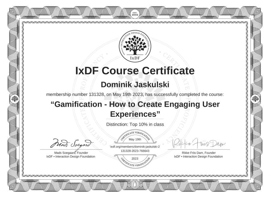 The IxDF Course Certificate above is awarded to Dominik Jaskulski with a Top 10% Distinction in formal recognition of their coursework surpassing the rigorous benchmarks of exceptional performance established by the IxDF Educational Codex.