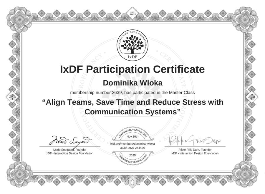 Dominika Wloka's IxDF Masterclass Certificate: Align Teams, Save Time and Reduce Stress with Communication Systems