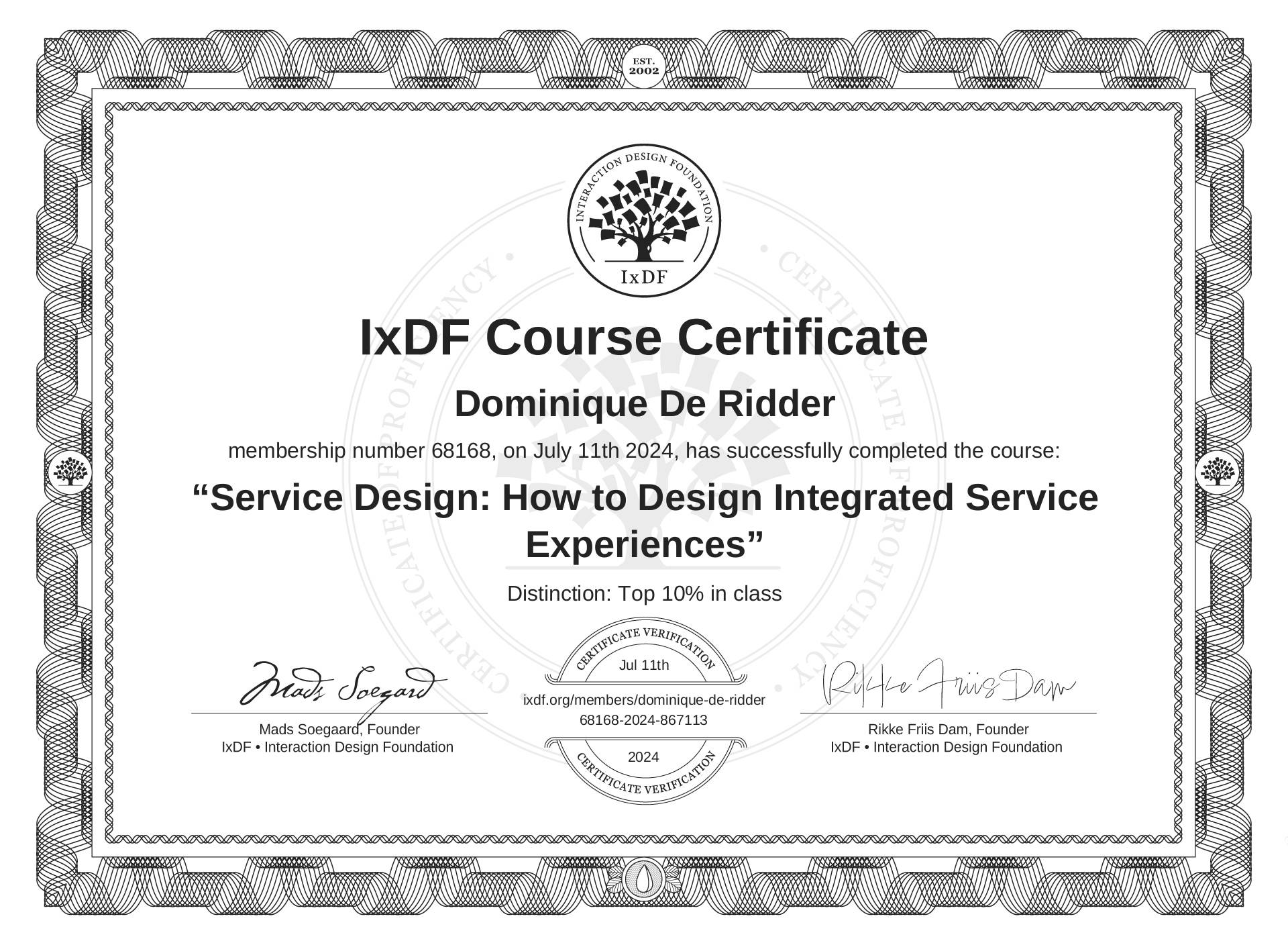 The IxDF Course Certificate above is awarded to Dominique De Ridder with a Top 10% Distinction in formal recognition of their coursework surpassing the rigorous benchmarks of exceptional performance established by the IxDF Educational Codex.