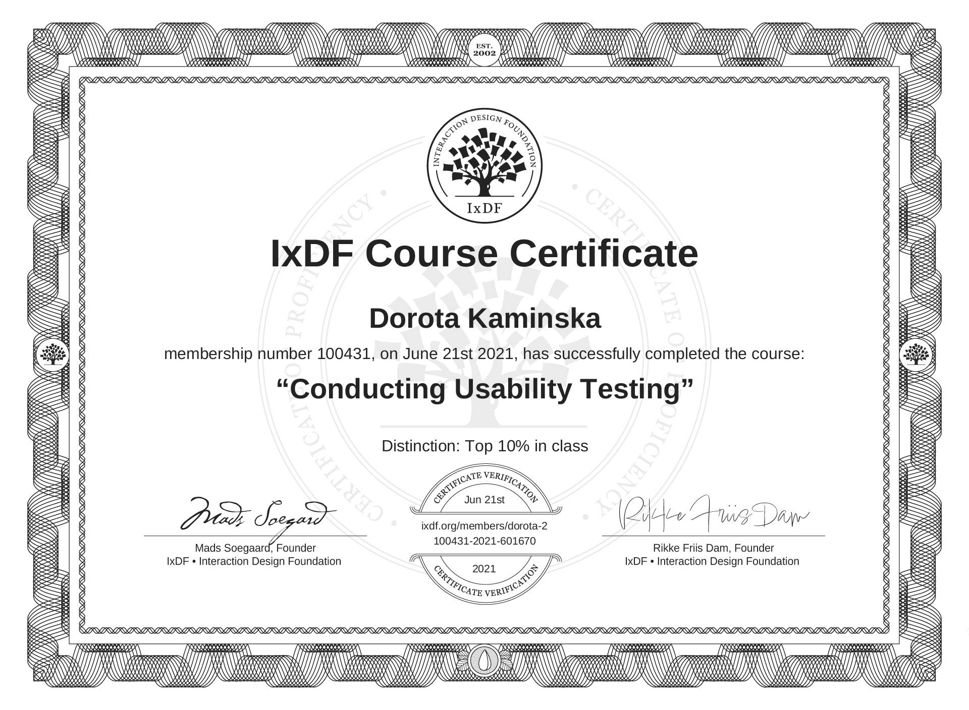 The IxDF Course Certificate above is awarded to Dorota Kamińska with a Top 10% Distinction in formal recognition of their coursework surpassing the rigorous benchmarks of exceptional performance established by the IxDF Educational Codex.
