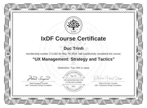 IxDF Course Certificates are awarded to Duc Trinh in formal recognition of their coursework surpassing the rigorous benchmarks of exceptional performance established by the IxDF Educational Codex.