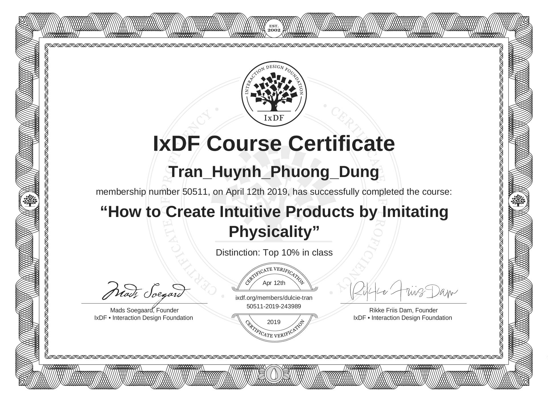 Tran_Huynh_Phuong_Dung's IxDF Course Certificate: How to Create Intuitive Products by Imitating Physicality