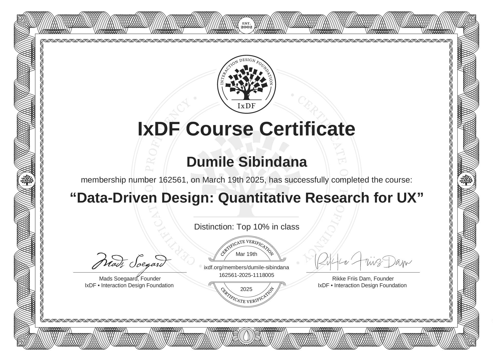 Dumile Sibindana's IxDF Course Certificate: Data-Driven Design: Quantitative Research for UX
