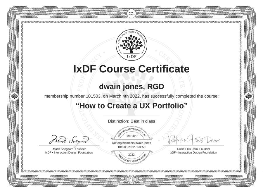 dwain jones, RGD's IxDF Course Certificate: How to Create a UX Portfolio