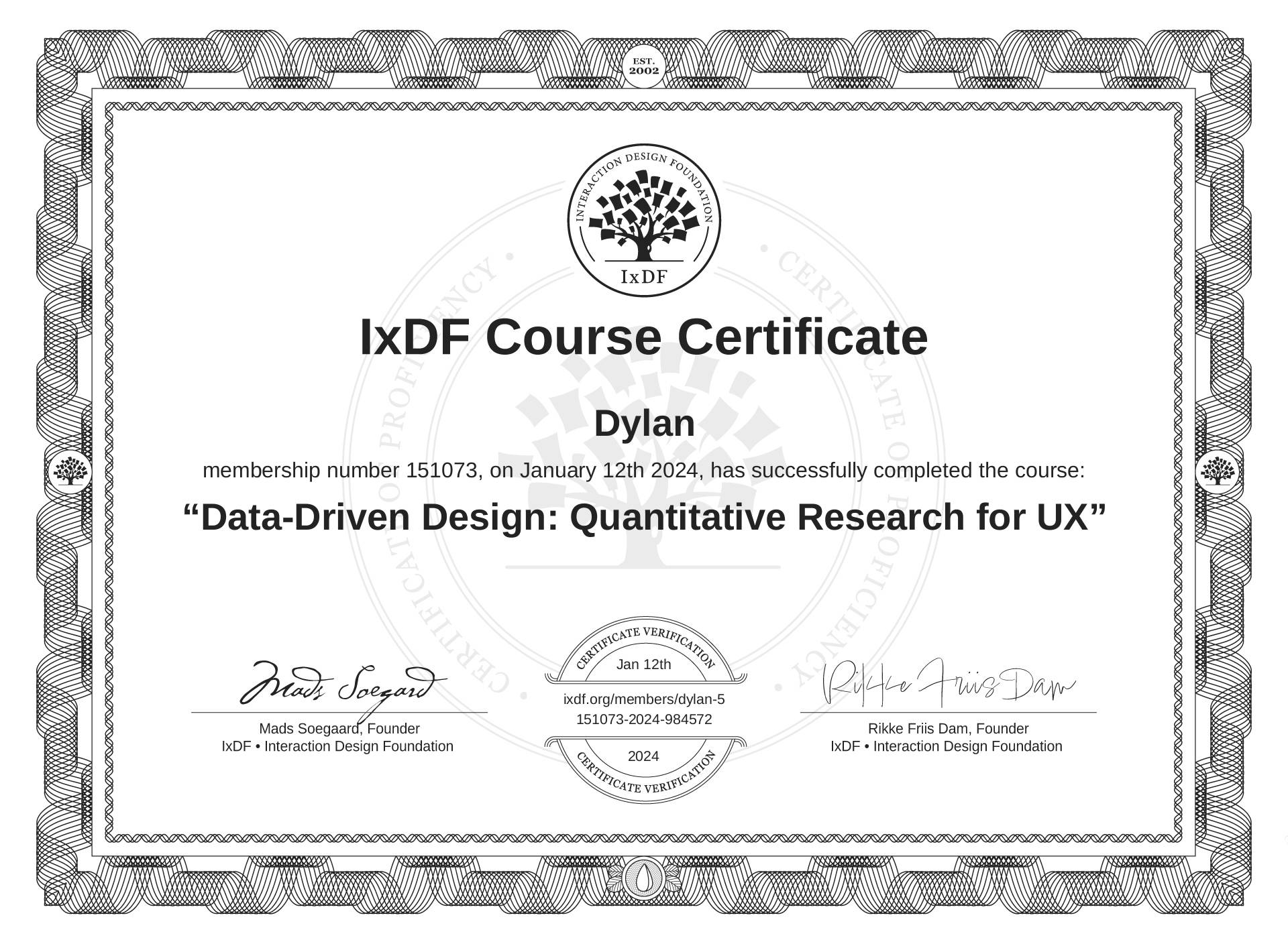 Dylan's IxDF Course Certificate: Data-Driven Design: Quantitative Research for UX