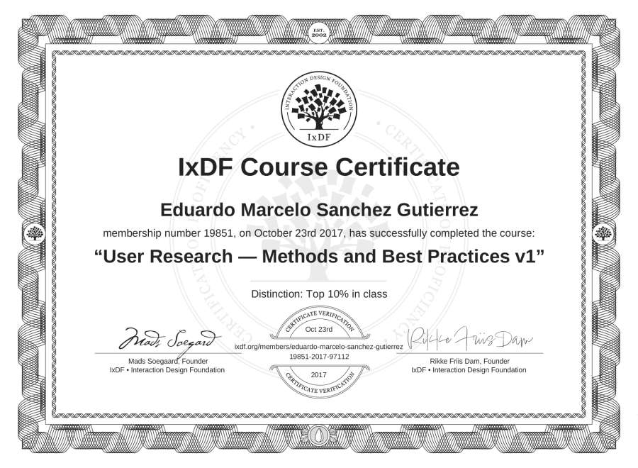 Eduardo Marcelo Sánchez Gutiérrez's IxDF Course Certificate: User Research — Methods and Best Practices v1