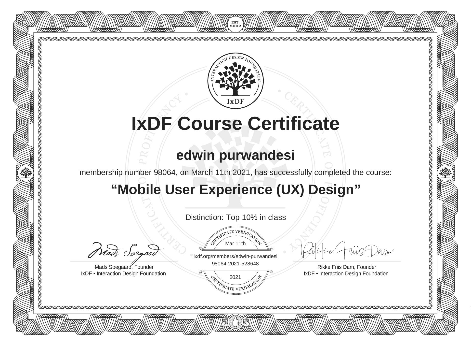 The IxDF Course Certificate above is awarded to edwin purwandesi with a Top 10% Distinction in formal recognition of their coursework surpassing the rigorous benchmarks of exceptional performance established by the IxDF Educational Codex.
