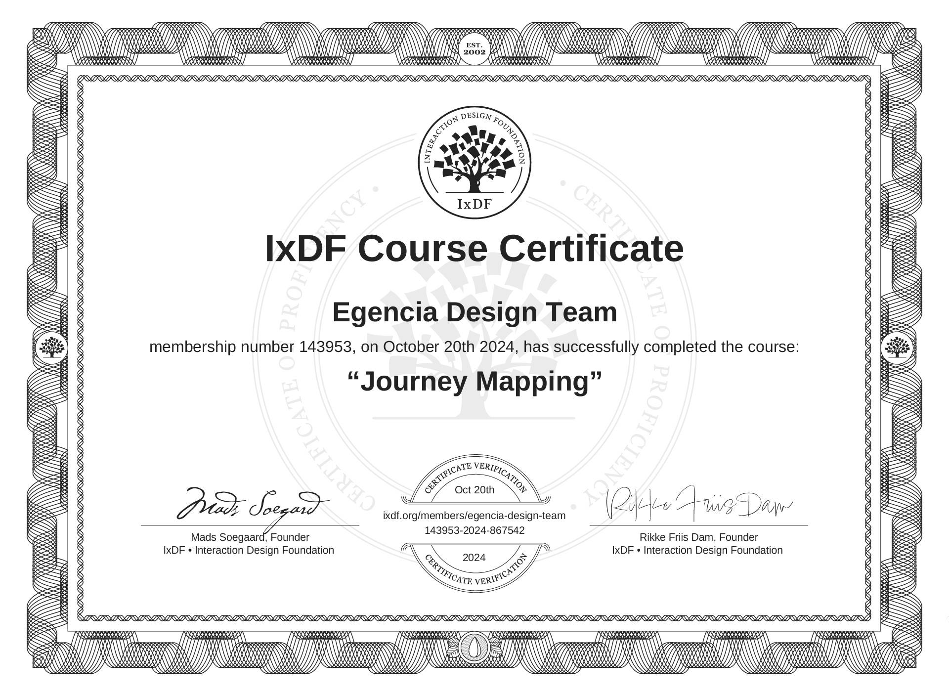 The IxDF Course Certificate above is awarded to Egencia Design Team in formal recognition of their coursework surpassing the rigorous benchmarks of exceptional performance established by the IxDF Educational Codex.