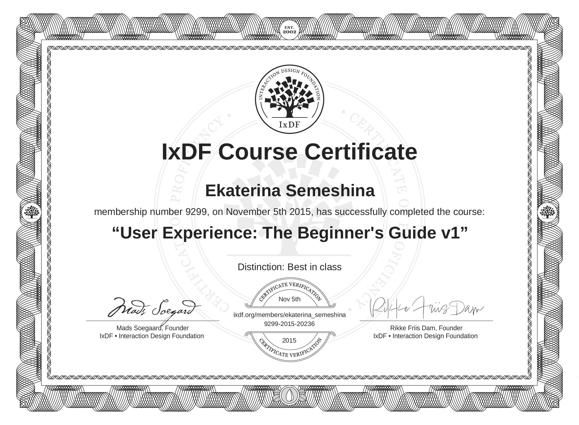 The IxDF Course Certificate above is awarded to Ekaterina Semeshina with a Best in Class Distinction in formal recognition of their coursework surpassing the rigorous benchmarks of exceptional performance established by the IxDF Educational Codex.