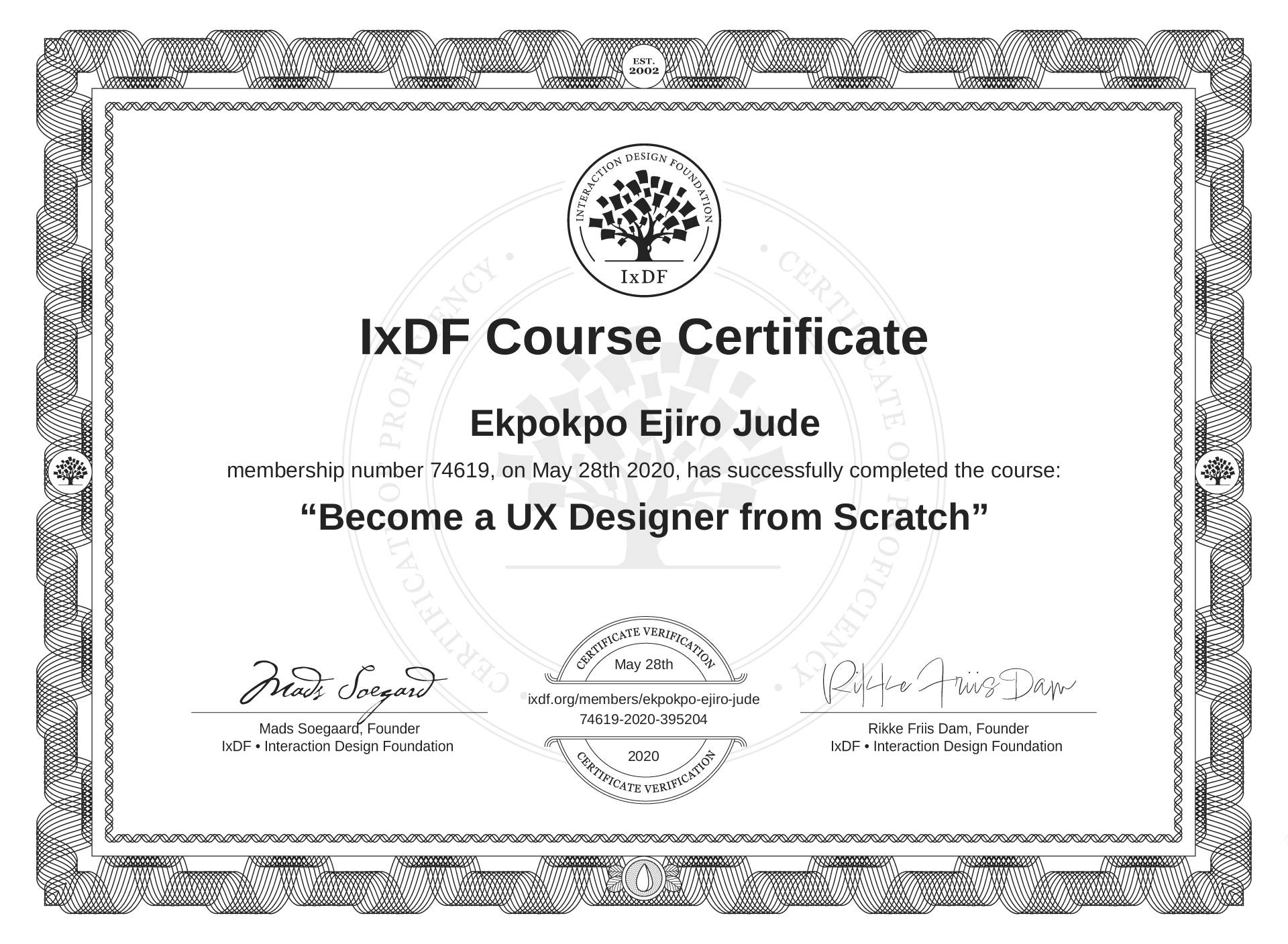 The IxDF Course Certificate above is awarded to Ekpokpo Ejiro Jude in formal recognition of their coursework surpassing the rigorous benchmarks of exceptional performance established by the IxDF Educational Codex.