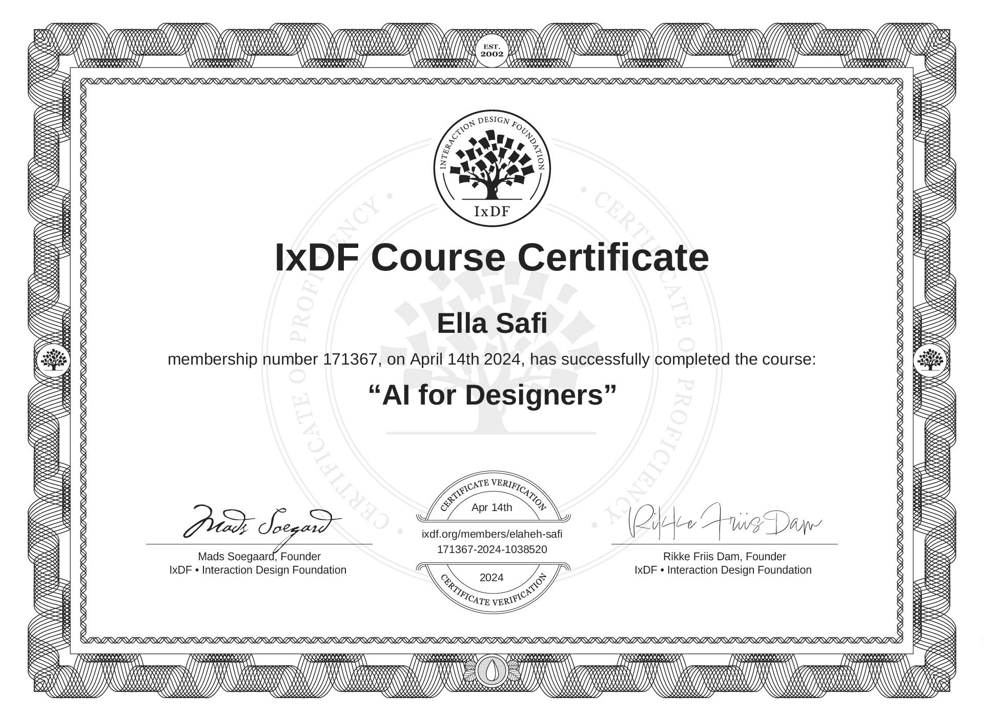 The IxDF Course Certificate above is awarded to Ella Safi in formal recognition of their coursework surpassing the rigorous benchmarks of exceptional performance established by the IxDF Educational Codex.