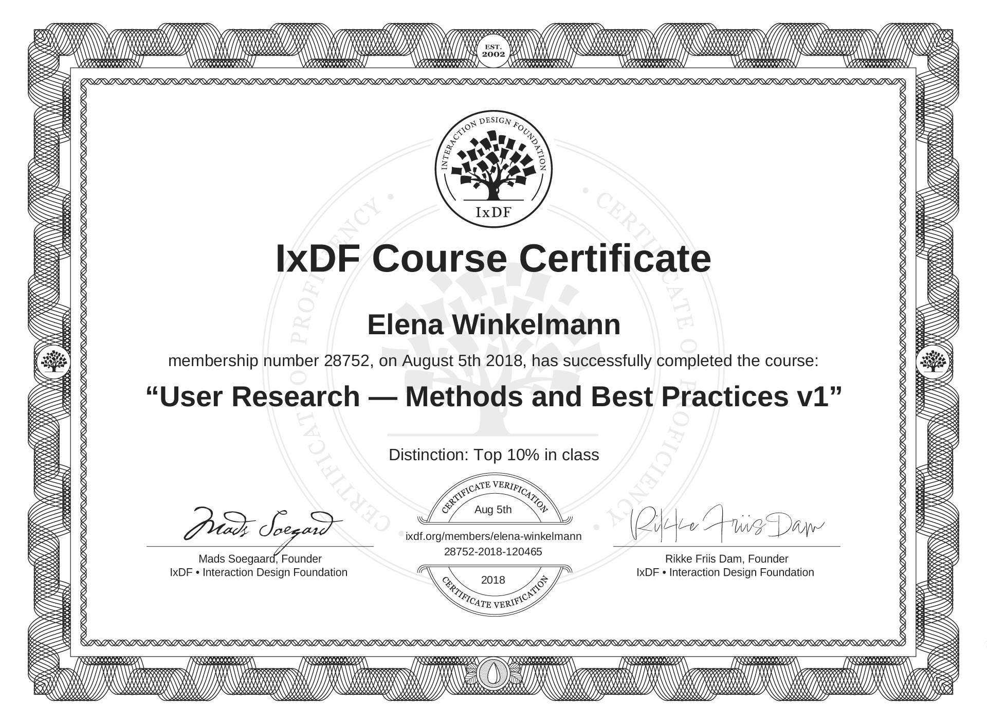 The IxDF Course Certificate above is awarded to Elena Winkelmann with a Top 10% Distinction in formal recognition of their coursework surpassing the rigorous benchmarks of exceptional performance established by the IxDF Educational Codex.